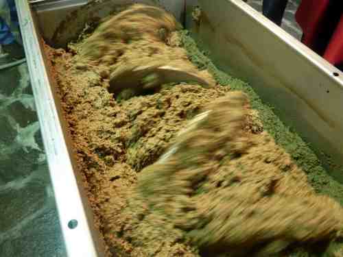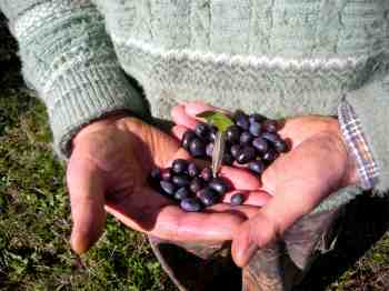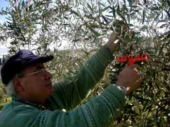 For harvesting, we use a comb, a plastic instrument that looks much like a giant hair comb. It slides along the branches and pulls the olives off without damaging the leaves or the tree. The olives drop gently to a net spread beneath the tree and when the net is full, the olives are brought immediately to the mill or frantoio right here on the estate.