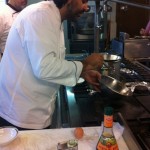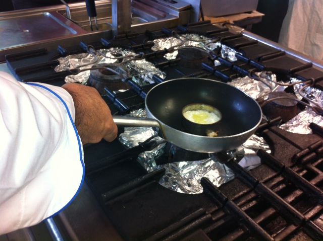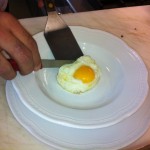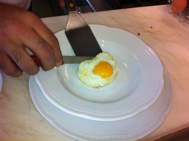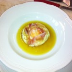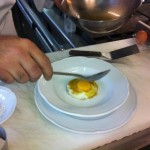 Uovo al tegamino con emulsione di olio e aceto di mele e Tarese – Foto ricetta dello Chef Marco Stabile presentato a Villa Campestri Olive Oil Resort il 26 ottobre 2013.