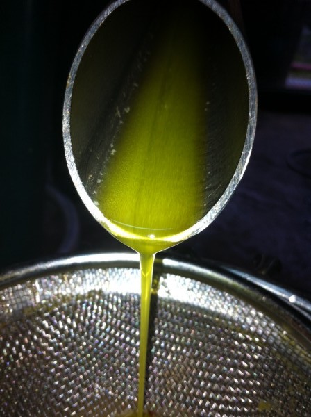 L’operazione conclusa. In 45 minuti dal momento in cui le olive entrano nella tramoggia di carico del frangitore esce il nostro amato olio!